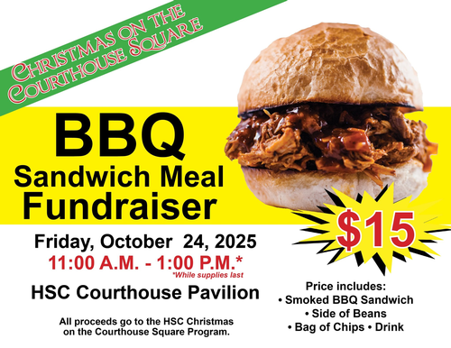 Name: Christmas on the Courthouse Square BBQ Sandwich FundraiserDate: October 24, 2025Time: 11:00 AM - 1:00 PM CDTEvent Description:Fundraiser for Christmas on the Courthouse Square