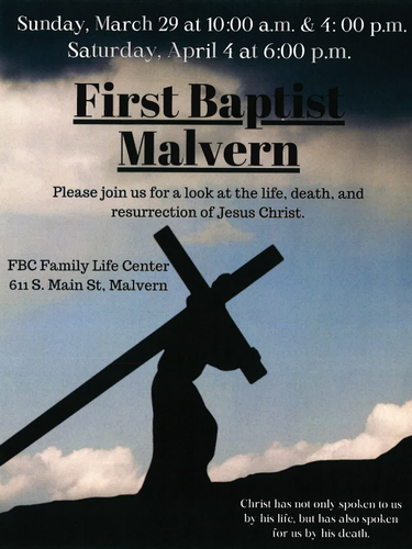 Please join us for a look at the life, death and resurrection of Jesus ChristLocation:First Baptist Church