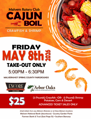 Name: Malvern Rotary Cajun BoilDate: May 8, 2026Time: 5:00 PM - 6:30 PM CDT