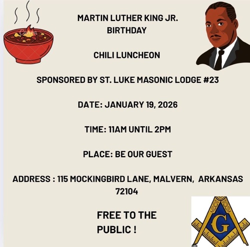 Name: Martin Luther King Jr. Birthday Chili LuncheonDate: January 19, 2026Time: 11:00 AM - 2:00 PM CST
