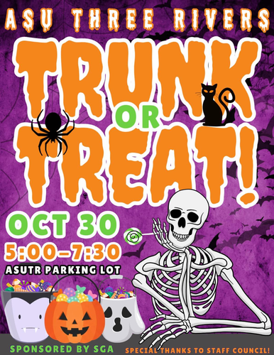Name: Trunk-or-Treat presented by ASU Three RiversDate: October 30, 2025Time: 5:00 PM - 7:30 PM CDTEvent Description:Trunk-or-Treat presented by ASU Three Rivers
